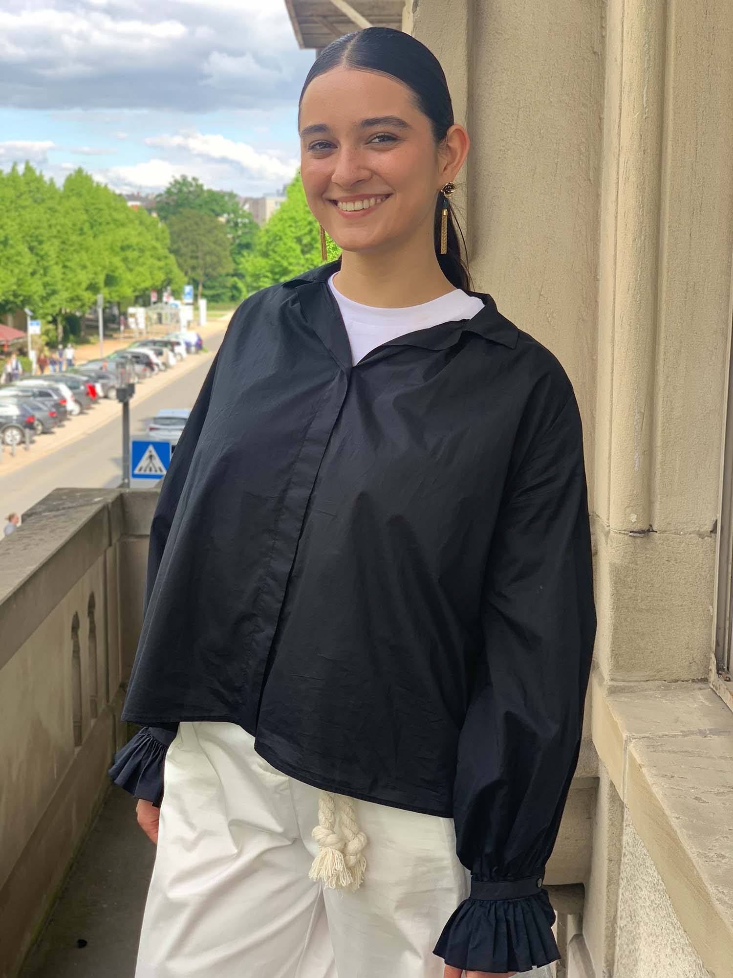 Fil Noir: Leichte Baumwollbluse in Mitternachtsblau, kleiner Kragen, durchgehende, verdeckte Knopfleise, lange, gebauschte Ärmel mit schmaler Manschette und anschließender Rüsche, extra weite und leicht ausgestellte Passform. Material: 100% Baumwolle