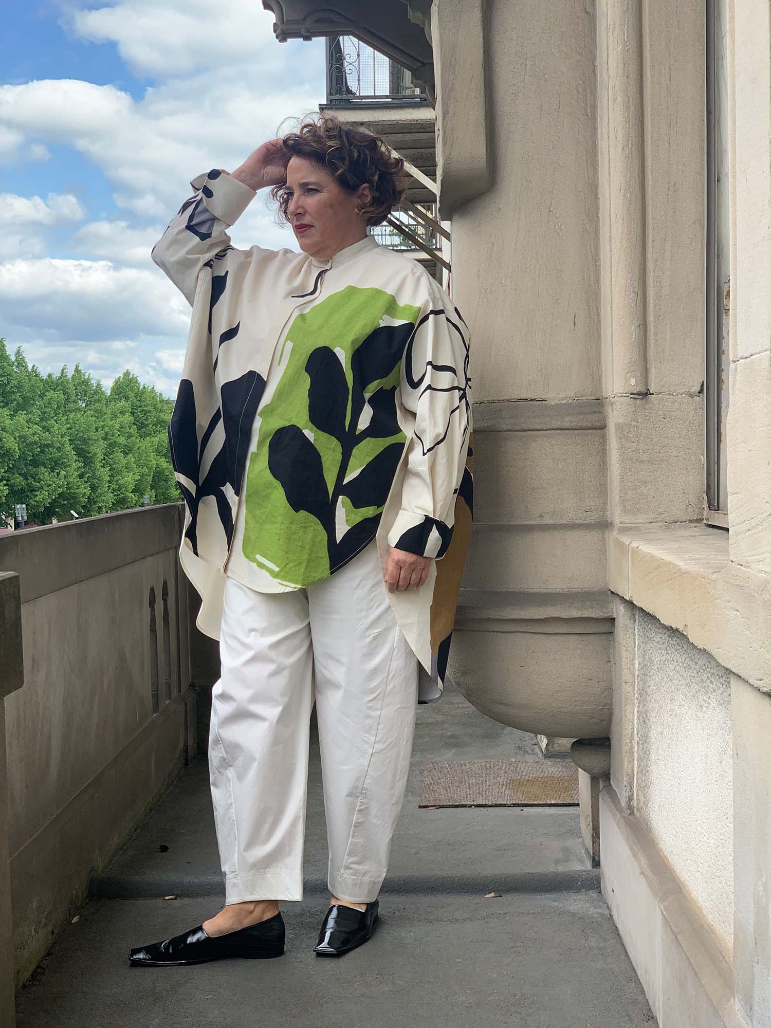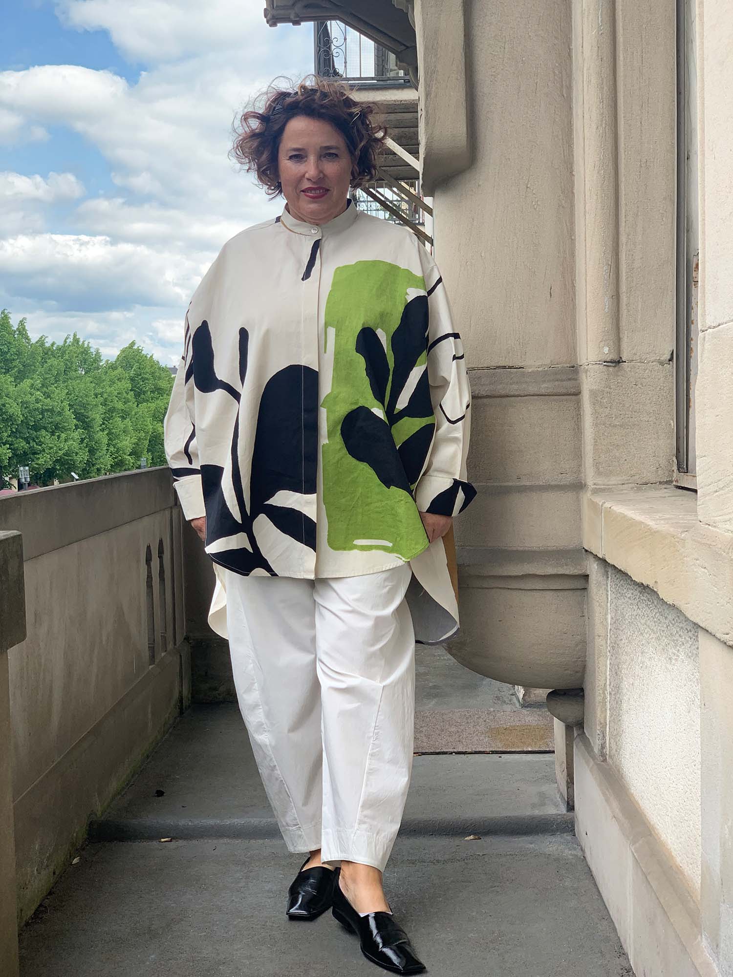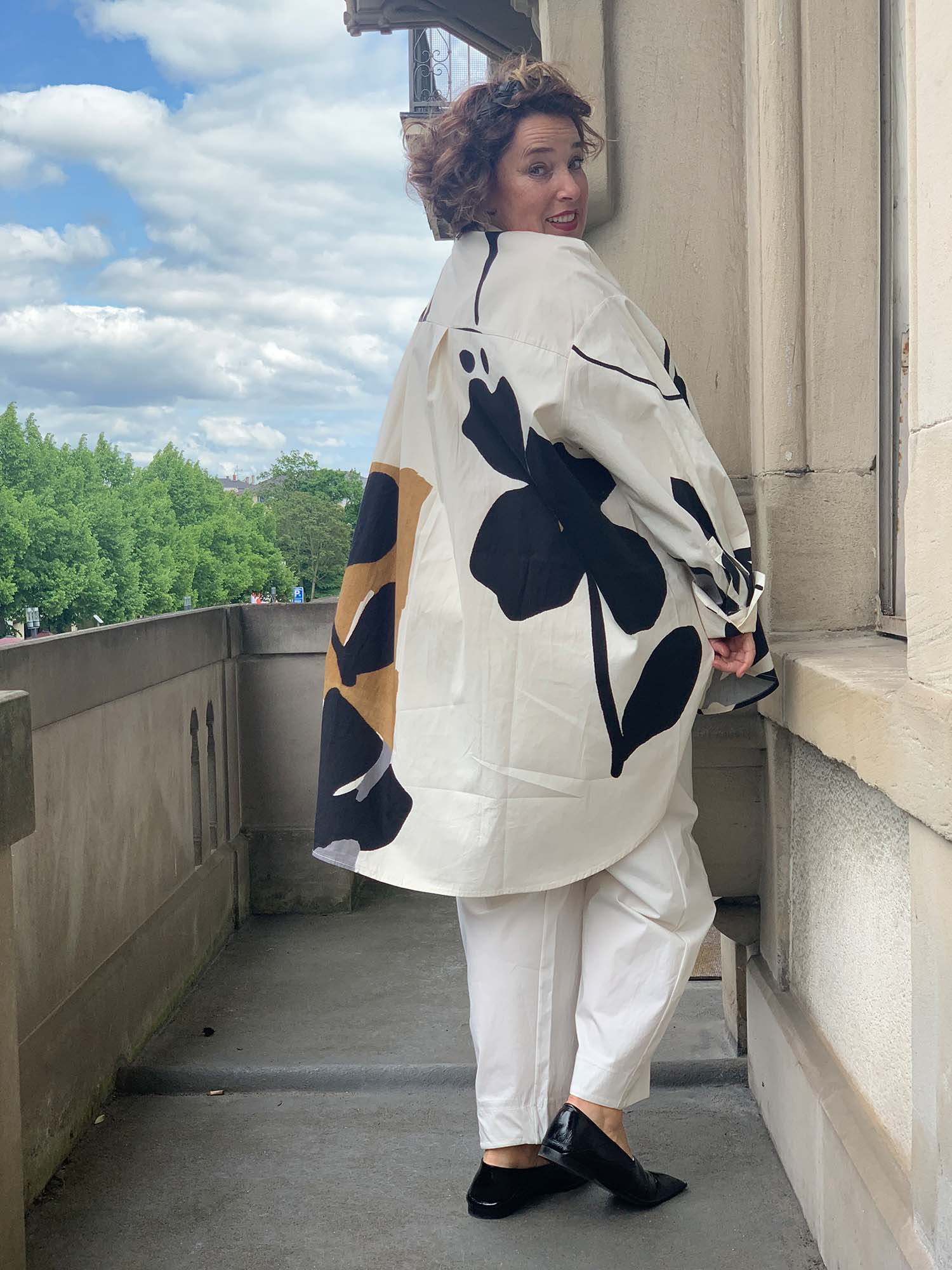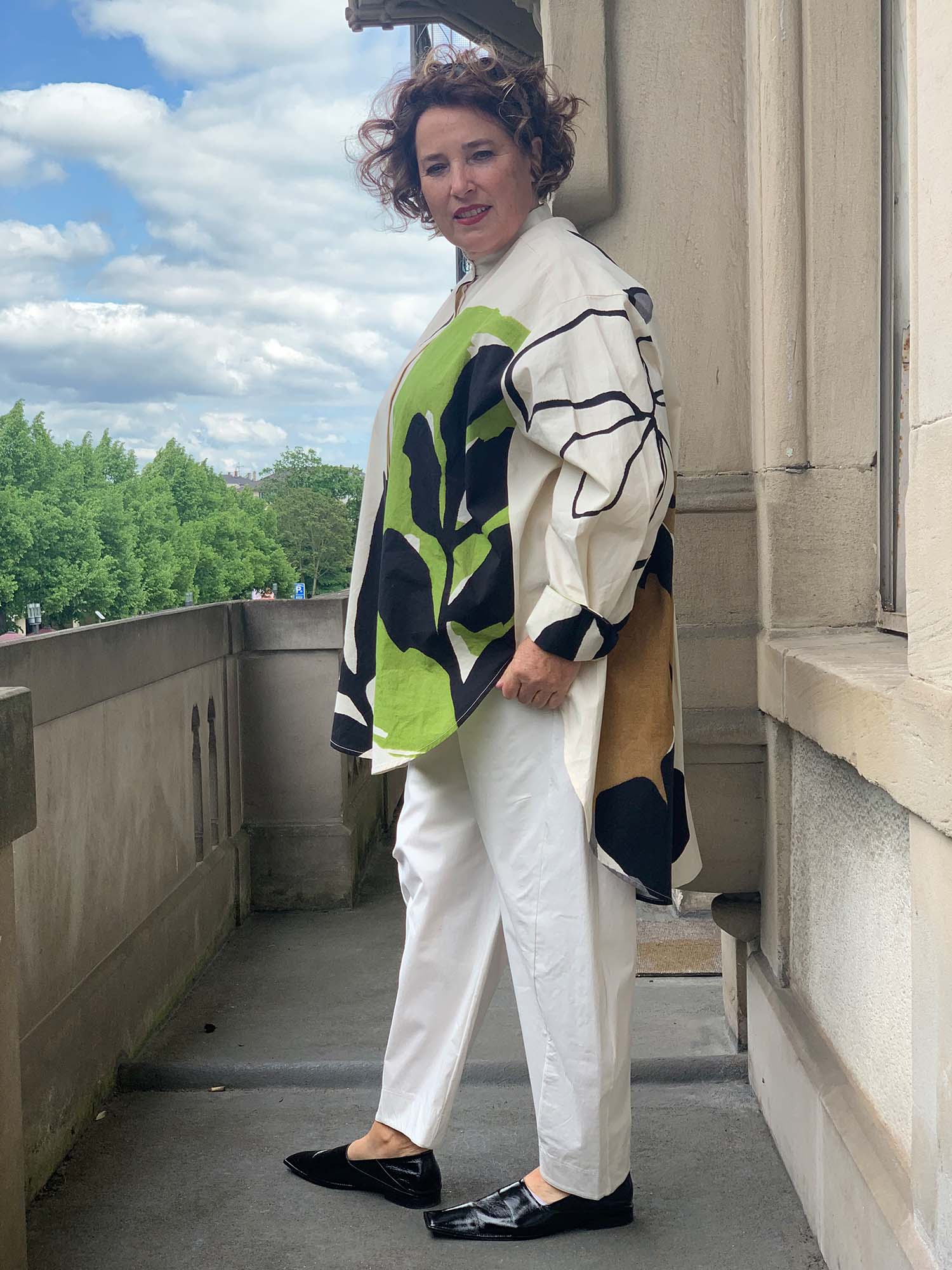 PDR Phisique du Role: Cooles Oversized Hemd in Art-Print, verdeckte Knopfleiste, Stehkragen, hinten länger. Material: 100% Baumwolle.